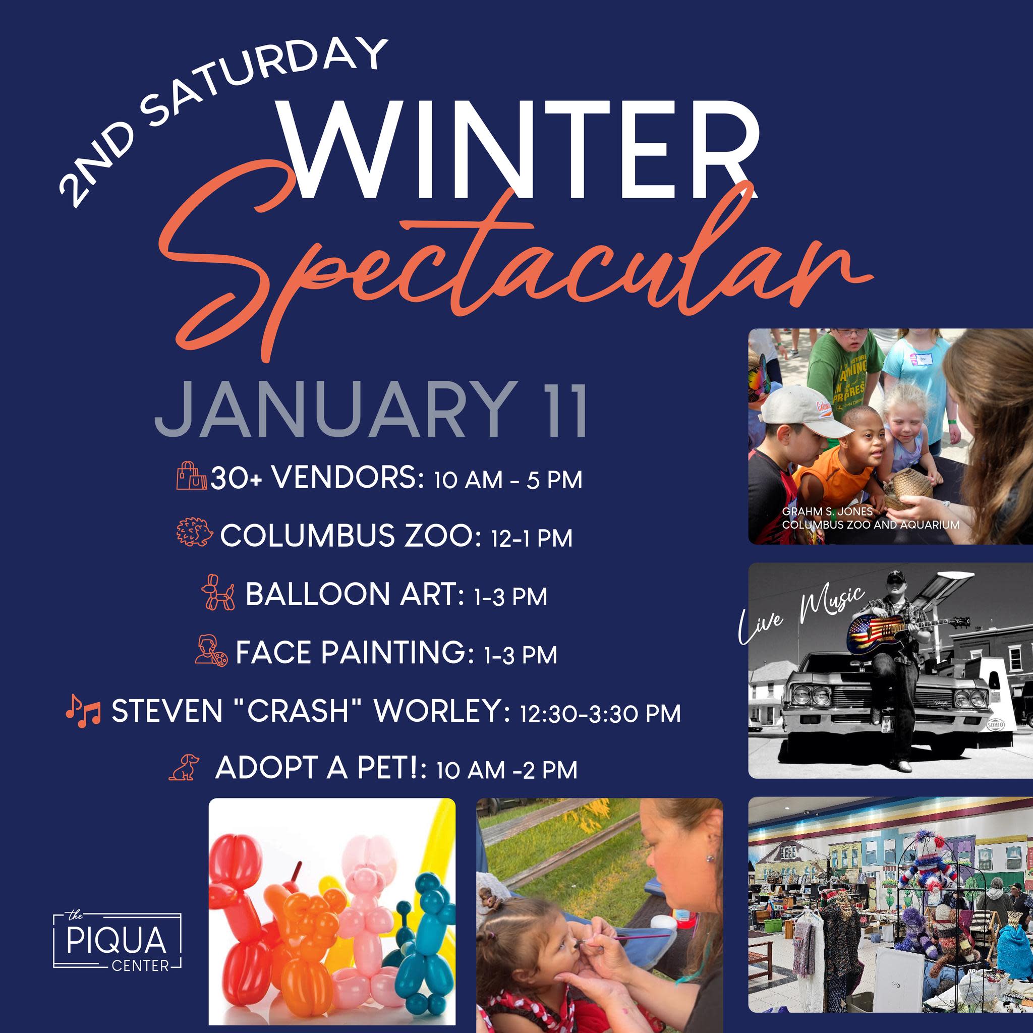 30+ Vendors: 10am-5pm Columbus Zoo: 12pm-1pm Ballon Art: 1pm-3pm Face Paint: 1pm-3pm Steven 'Crash' Worley: 12:30pm-3:30pm Adopt a pet: 10am-2pmImages
