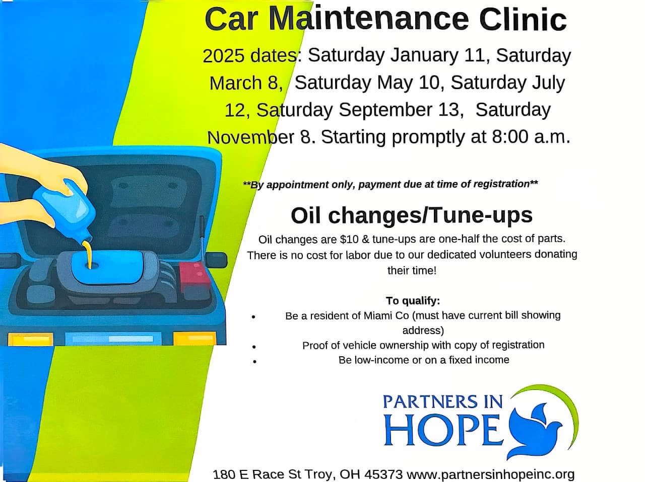 *By appointment only, payment due at time of registration* Oil changes/Tune-Ups Oil changes are $10 & tune-ups are one-half the cost of parts. There is no cost for labor due to our dedicated volunteers donating their time!Images