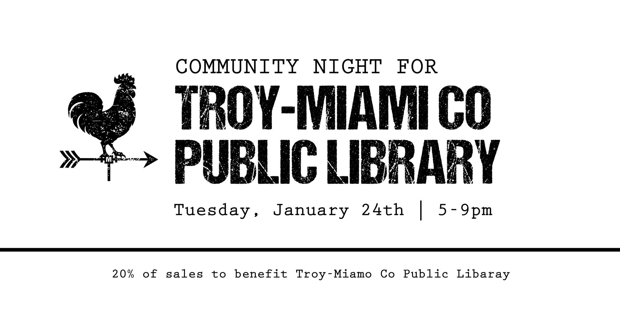 Moeller Brew Barn is happy to host Troy-Miami County Public Library for Community Night on Tuesday, January 24th - from 5-9pm, 20% of sales will benefit the Troy-Miami Co. Public Library. Cheers