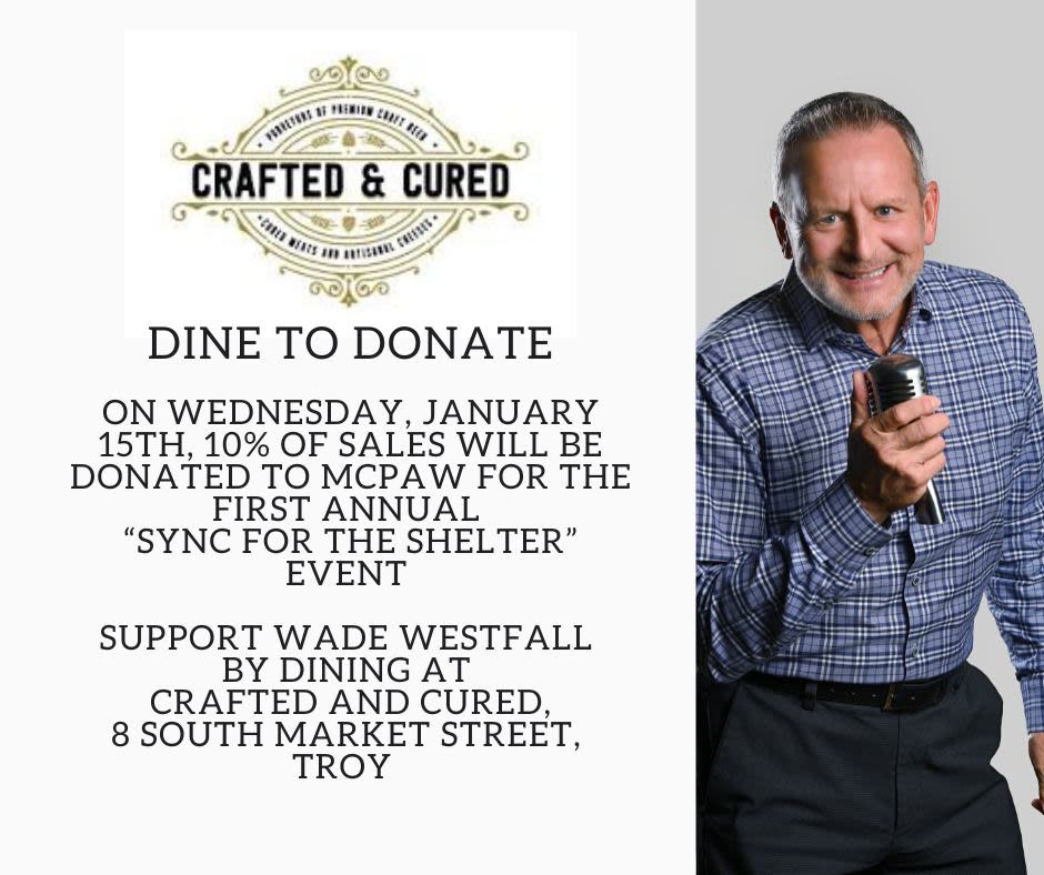 On Wednesday January 15th, 10% of sales will be donated to McPaw for the first annual 'sync for the shelter' event Support Wade Westfall by dining at Crafted & Cured 8 S. Market St.Images
