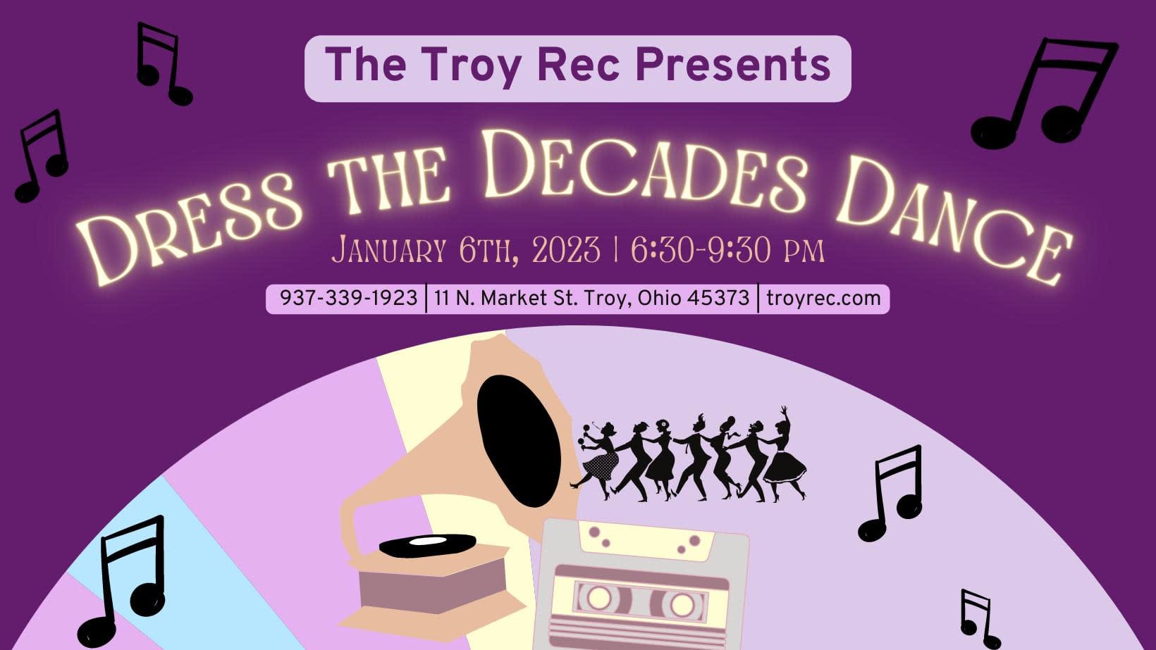 The Troy Rec presents a 'Dress the Decades Dance' in conjunction with Troy Main Street's First Friday Event. When: January 6th Where: Troy Rec, 11 N Market Street, Troy Time: 6:30-9:30 pm Admission: $5/person, $20/family (pay at the door, cash/credit) Light Refreshments served throughout the night. Wear your best retro or vintage attire and dance the night away to hit songs from every decade! Costume contest for best child and best adult outfit, winners receive a gift basket provided by Troy Main Street. Relive YOUR Rec memories: bring a picture of the Rec from when you were a teen to be entered into a raffle for a Troy Gift Basket and a free Rec Rental! A community event at the 'place for fun since 1941!' Family friendly event!Images
