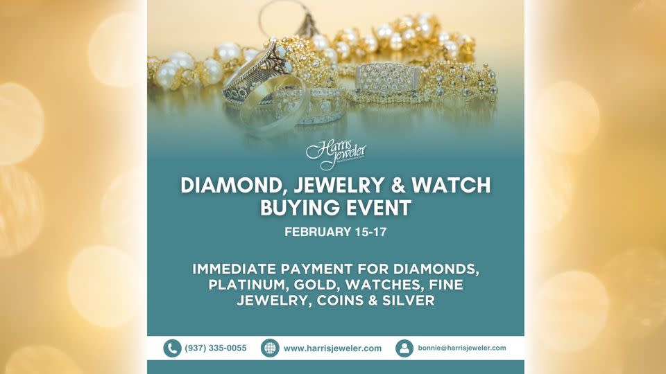 Join us for our first Buying Event of 2024! February 15-17, 2024 Buying all diamonds, gold, platinum, silver, designer and estate jewelry, coins, Swiss watches and MORE! Bring in old jewelry and walk out with new Harris Jeweler jewelry OR $$ in-hand! With gold and diamonds at a high, we are paying the highest prices in our 77-year history, more than your typical pawn shop, jewelry store or estate buyers! Here are the details: 💎 We're paying an EXTRA 10% on your precious metal with a scheduled appointment during our event! (this is a guaranteed way to walk out with more $$. Make an appt. with the link below) 💎 Want to buy something new? We will give you 50% more in trade for your old jewelry when you use it to buy something in our store!* 💎 Have your jewelry evaluated for FREE by the ONLY Certified Gemologist Appraiser in the Dayton Area! Call or text 937-335-0055 to set a private appointment or email bonnie@harrisjeweler.com to receive an extra 10% when we buy your precious metal! You can also set your appointment and see what we buy here: https://www.harrisjeweler.com/pages/gold-buying-event-feb# *50% more in trade applies to precious and semi-precious metal values only and cannot be combined with additional 10% more.Images