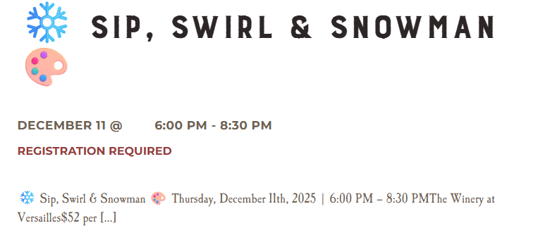 Register here: https://wineryatversailles.com/event/%e2%9d%84%ef%b8%8f-sip-swirl-snowman-%f0%9f%8e%a8/