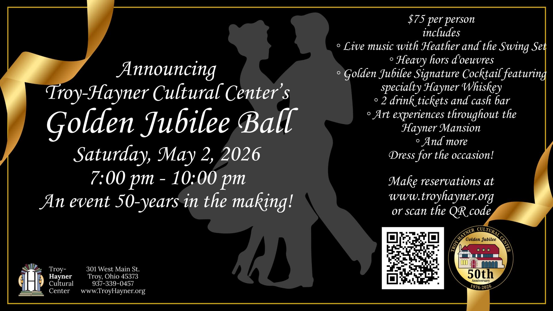 Place your reservation by calling the Hayner Center at 937-339-0457 or visit: https://www.troyhayner.org/golden-jubilee-ball